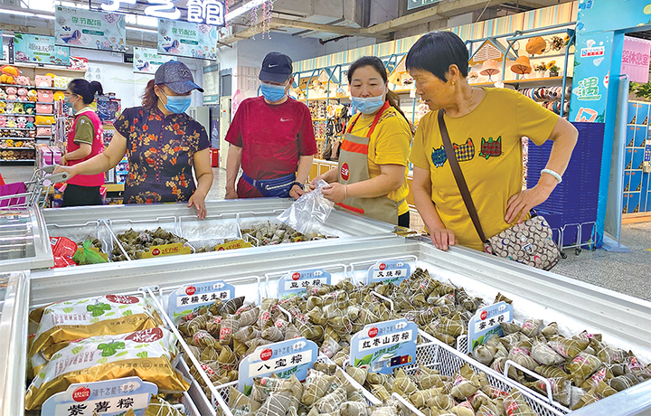 當(dāng)日上午,記者在沁園路一家超市入口看到,粽子被擺放在顯眼位置,蜜棗、豆沙等口味一應(yīng)俱全,不少市民駐足選購。