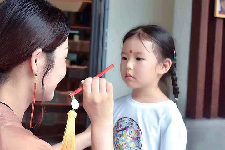 6月14日,一位家長用朱砂在為孩子點紅送祝福。 段二平 攝