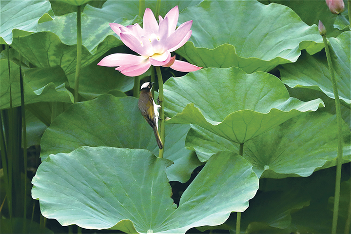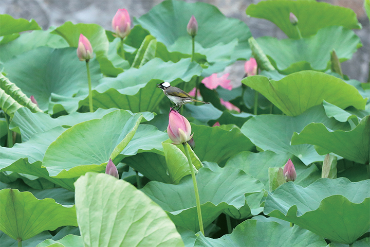 池塘里,大片荷葉中點綴著星星點點的粉紅,格外俏皮可愛。每朵荷花都以獨特的姿態(tài)映入眼簾,含苞待放的,剛剛張開兩三片花瓣的,已全部盛開的……朵朵荷花似亭亭玉立的少女,在碧綠荷葉的映襯和守護下,更顯粉嫩和秀美,正是“接天蓮葉無窮碧,映日荷花別樣紅”。