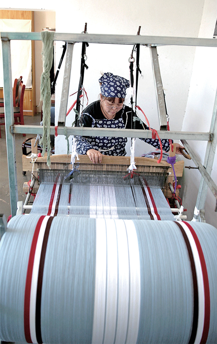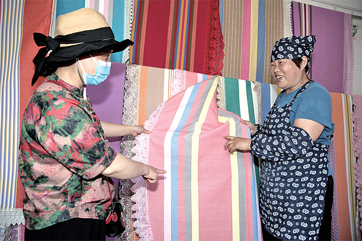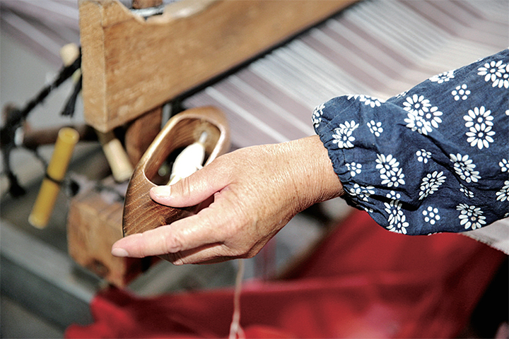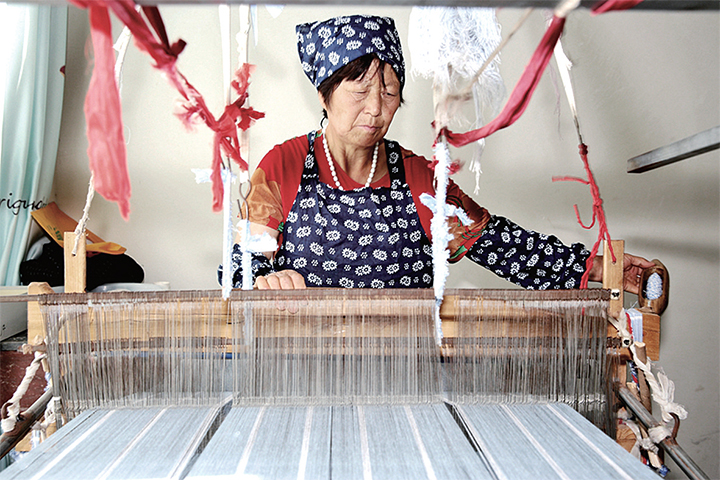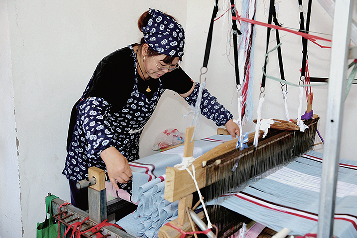 竹峪居委會是20世紀90年代建設黃河小浪底水庫時從山上搬遷下來的一個移民村,素有織布的傳統(tǒng),并流傳著一種古法織布技藝。該古法織布技藝包括打線、漿染、沌線、落線、經線、刷線、栓布、織布等70余道工序和平織、斜織、四葉織、壓花、挑花等獨特織法。