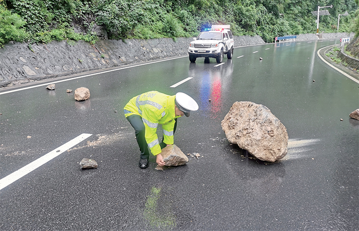 在城區(qū),受降雨影響,部分道路漬水嚴重,再加上雨天路滑、行車視線受影響等原因,導致小事故多發(fā)。示范區(qū)公安局交通管理支隊直屬大隊的民警冒雨指揮交通、用最快速度處理事故,保障城區(qū)道路的正常通行;在王屋山小有河段,山坡上落下的石頭滾到了道路中間,示范區(qū)公安局交通管理支隊第四大隊的民警對道路交通安全隱患進行排查,并迅速將路面落石清理干凈,不影響過往車輛的正常通行;在S240省道廟凹路段,示范區(qū)公安局交通管理支隊第六大隊的民警將路面的落石清理干凈,并提醒過往車輛注意行車安全;菏寶高速濟邵段因雨大,邵原隧道出口、入口邊坡塌方嚴重,高速交警大隊與路政、養(yǎng)護部門協(xié)同配合,積極引導車輛有序通行。