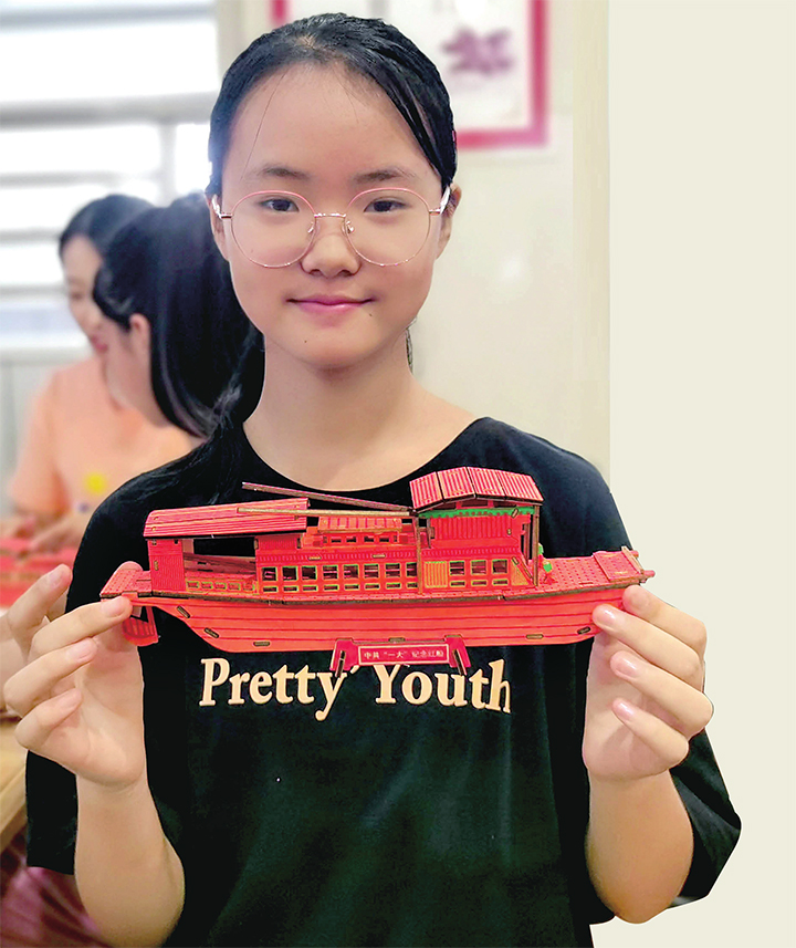 7月24日,在濟(jì)源博物館青少年活動(dòng)中心,小朋友展示已拼裝好的紅船。