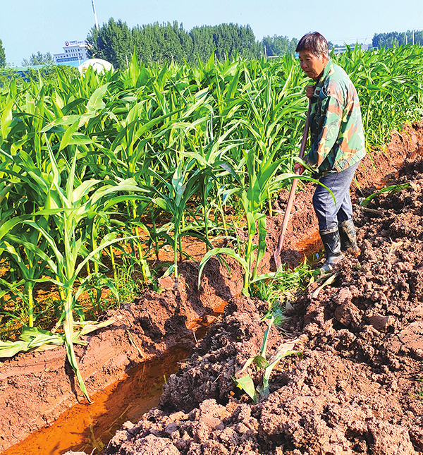 7月26日,梨林鎮(zhèn)一村民在玉米地排水。