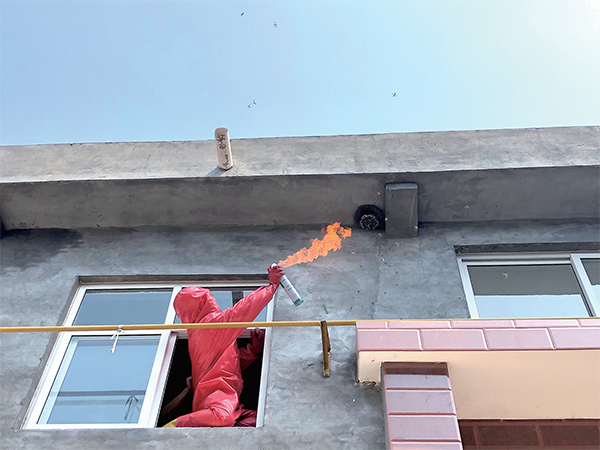 對房檐下的馬蜂窩“噴藥+火攻”