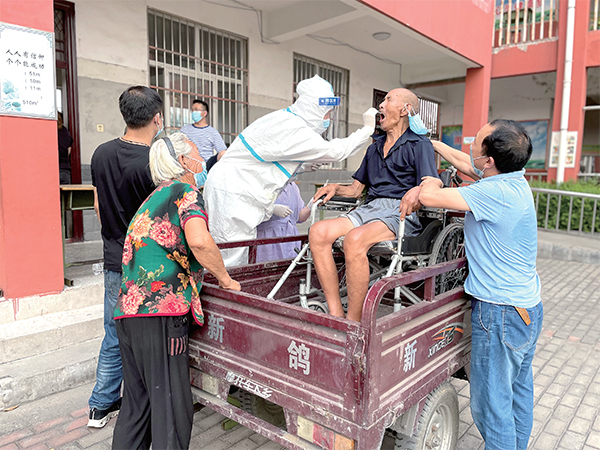 在原昌小學采樣點,感人的故事也在發(fā)生。坐著輪椅的磨莊村78歲村民李振安被家人抬放到一輛三輪車上前來檢測。了解老人的情況后,一名醫(yī)護人員主動走到他跟前進行采樣,而志愿者則在一旁扶著他的后背,精心呵護老人。
