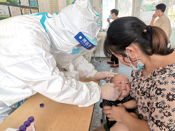 醫(yī)護人員李紅星(左一)耐心地給嬰兒采樣