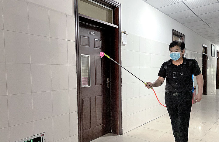 工作人員對(duì)學(xué)生宿舍進(jìn)行消殺。