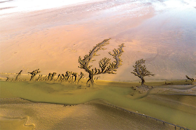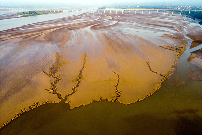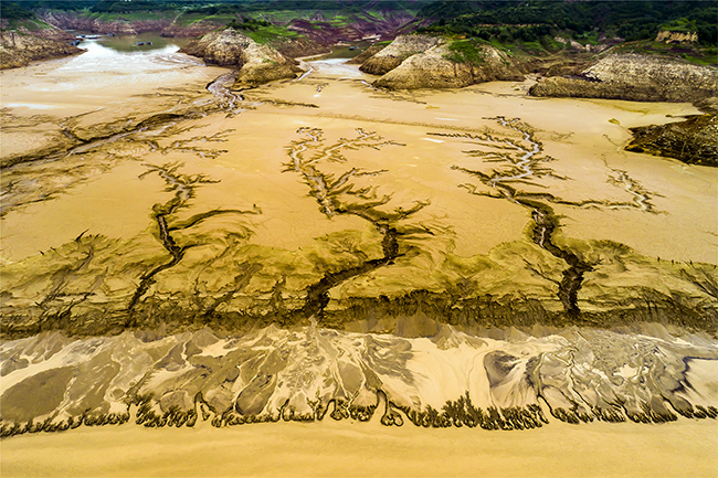 “黃河小浪底調水調沙后,河道水位下降,河床大面積裸露,形成造型各異的沙畫圖案,造型逼真、線條流暢,令人贊嘆。這些精美的景觀深深吸引了我。于是,我多次沿黃河踩點拍攝,拍攝了這組作品?!编噰鴷熣f。