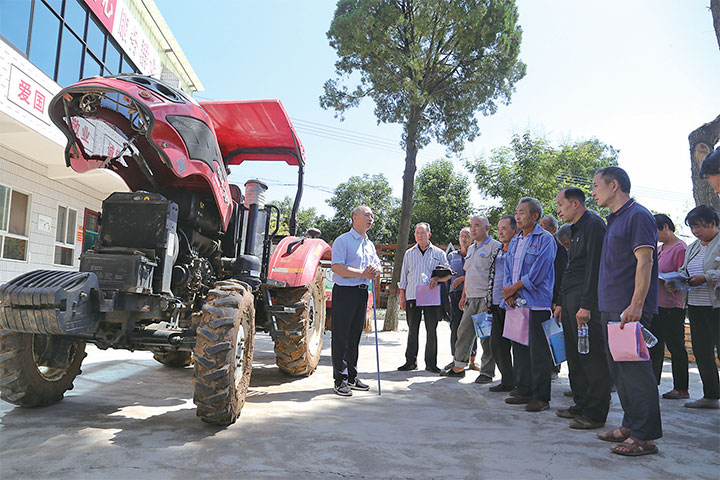 9月9日,在下冶鎮(zhèn)大嶺村,濟(jì)源農(nóng)機(jī)學(xué)校教師為村民講解農(nóng)機(jī)使用及維修知識(shí)。