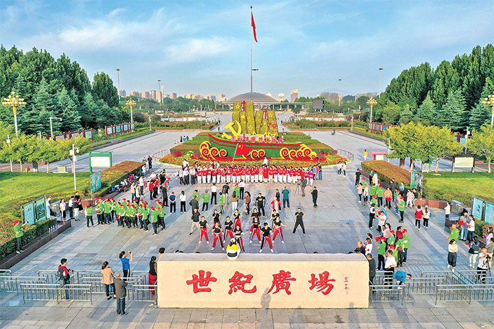 10月1日,濟(jì)源湨梁紅歌合唱隊(duì)在世紀(jì)廣場(chǎng)國(guó)慶主題花壇前,高唱《沒(méi)有共產(chǎn)黨就沒(méi)有新中國(guó)》《我的祖國(guó)》等紅色歌曲,祝福祖國(guó)繁榮昌盛。記者 李楠 攝