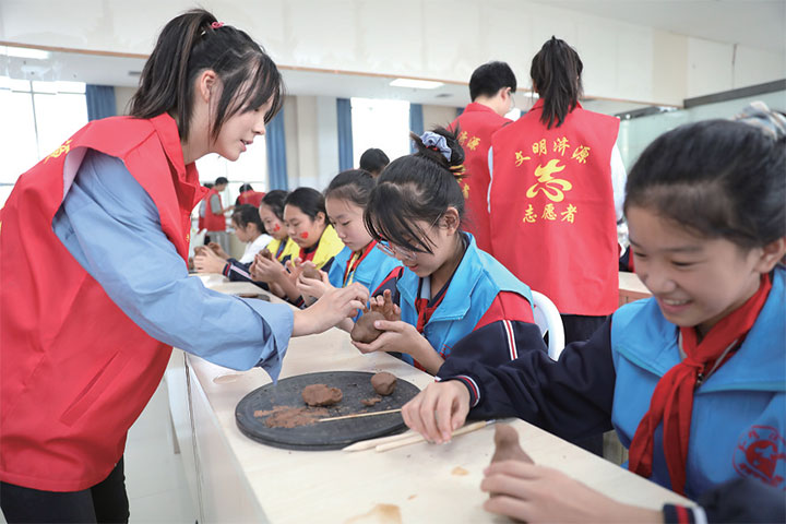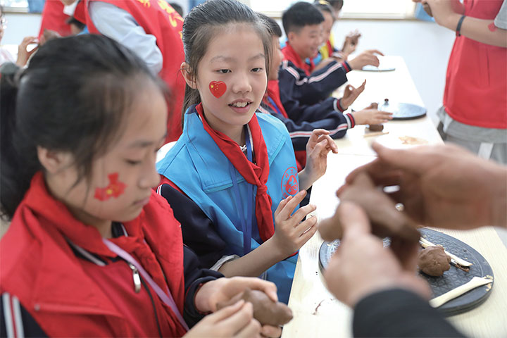 10月1日,孩子們在制作泥塑。當(dāng)日,濟源市青少年活動中心舉辦公益課堂,組織開展“向國旗敬禮”系列活動,內(nèi)容包括紅色主題宣講、制作泥塑、剪紙等,讓孩子們學(xué)習(xí)革命歷史和傳統(tǒng)文化,將文化自信根植于身,讓愛國情懷厚植于心。據(jù)了解,濟源市青少年活動中心今后將利用周末時間舉辦公益課堂。 記者 李楠 攝
