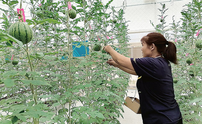 工人在無土栽培大棚里為吊瓜進(jìn)行人工授粉。