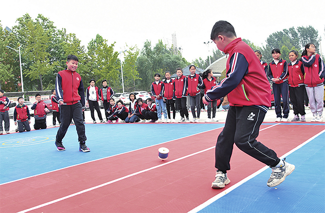 新學(xué)期開(kāi)學(xué)以來(lái),濟(jì)源市積極落實(shí)“雙減”政策,將舞蹈、踢足螺等傳統(tǒng)文體項(xiàng)目引進(jìn)課堂,豐富教學(xué)內(nèi)容,提升學(xué)生綜合素質(zhì)。新華社發(fā)( 苗秋鬧 攝)
