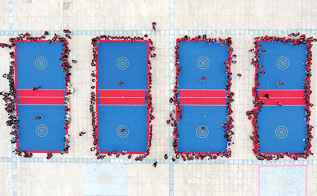 這是10月19日在濟(jì)源市梨林鎮(zhèn)中心小學(xué)拍攝的足螺訓(xùn)練現(xiàn)場(chǎng)(無(wú)人機(jī)照片)。