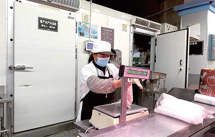 工作人員正在給市民挑選的肉進行稱重