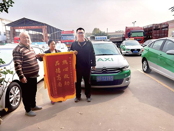 11月1日一大早,克井鎮(zhèn)佃頭村村民鄭濤濤一家人來(lái)到濟(jì)源環(huán)球出租車公司,將一面錦旗送到了“的哥”張文杰的手中。幾番推辭后,張文杰收下了錦旗,將家屬購(gòu)買的水果和牛奶又塞回到了家屬的手中?!板\旗我收下了,東西我不能要,孩子還在住院,這些讓孩子吃?!睆埼慕苷f(shuō)。