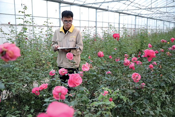 11月2日,在濟(jì)源市錦田種苗有限公司鮮切花種植大棚里,技術(shù)人員查看鮮切花生長(zhǎng)情況。
