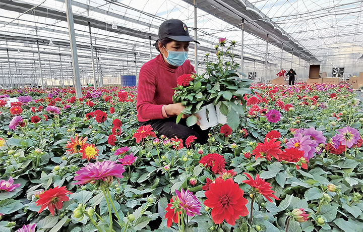 在玉泉都市農(nóng)業(yè)示范園的一座日光溫室里,工人正在查看花卉長勢。