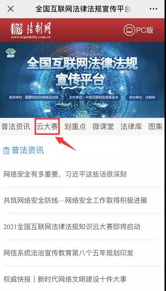 03 進(jìn)入互聯(lián)網(wǎng)法律法規(guī)宣傳平臺手機(jī)版點(diǎn)擊【云大賽】-【參賽入口】
