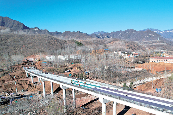 11月30日,S230沿南太行旅游公路一期工程跨S308分離式立交橋上,施工人員正在鋪裝橋面。