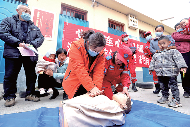 近日,在沁園街道正興公司家屬院內(nèi),濟源紅十字會工作人員為群眾講解心肺復蘇急救方法。