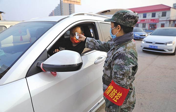 1月18日,留莊英雄民兵營(yíng)民兵正在村口疫情防控卡點(diǎn)執(zhí)勤。記者 張佩佩 攝