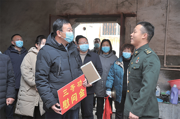 為認(rèn)真貫徹落實(shí)習(xí)近平關(guān)于“讓軍人成為全社會(huì)最尊崇的職業(yè)”的重要指示精神,繼承和發(fā)揚(yáng)擁政愛民優(yōu)良傳統(tǒng),讓現(xiàn)役官兵、退役老兵及廣大軍屬和困難群眾度過一個(gè)祥和安定的春節(jié),在新春佳節(jié)來臨之際,市人武部、示范區(qū)退役軍人事務(wù)局聯(lián)合鎮(zhèn)(街道)開展春節(jié)期間“大走訪、大慰問”活動(dòng),為立功受獎(jiǎng)現(xiàn)役官兵家庭、退役軍人及其他優(yōu)撫對(duì)象代表送去黨和政府的關(guān)懷和祝福。
