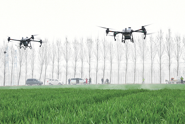 3月30日,在濟(jì)源市五龍口鎮(zhèn)西逯寨村,農(nóng)技人員操作植保無人機(jī)在麥田作業(yè)。