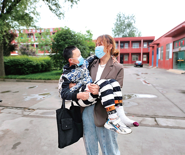 在中王小學(xué)的校園里,最近總能看到代麗抱著張笑天進(jìn)出教室的身影,以及4個(gè)小男生扶著張笑天去廁所的畫面。