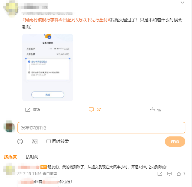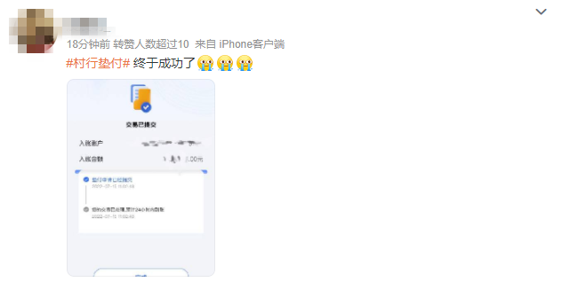 7月15日上午,大河財立方記者在微博看到有用戶發(fā)文稱她在11點10分左右成功提交墊付申請,11點56分,該微博用戶回復其他網友:資金已到賬。