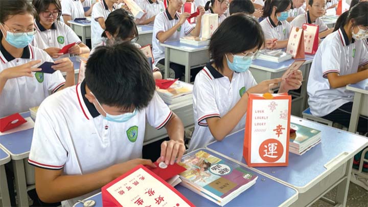 學(xué)生們走進(jìn)教室后,紛紛迫不及待地拆開“神秘禮包”,仔細(xì)端詳著禮物。有的同學(xué)看著老師手寫的賀卡,臉上露出了笑容;有些則相互交換賀卡,共同感受老師的關(guān)心和祝福。