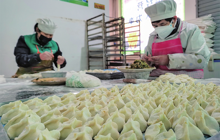 12月21日,玉泉街道的一家餃子店,店員正在趕制手工餃子,供應(yīng)市民餐桌。
