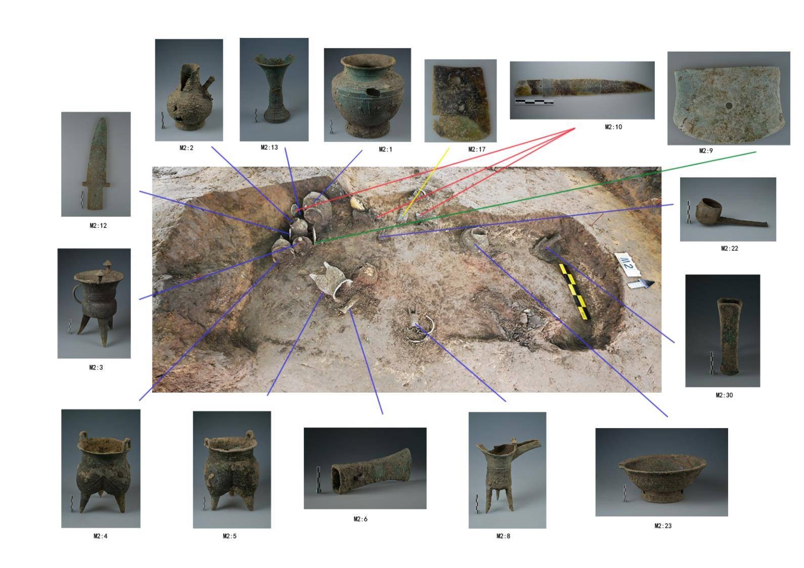 M2出土長(zhǎng)達(dá)75厘米的玉戈,是鄭州商城目前發(fā)現(xiàn)的最大玉戈。M2出土青銅器組合填補(bǔ)了學(xué)術(shù)界對(duì)中商青銅器文化研究的空白。M2底部六處殉狗坑分別位于頭部、腰部及四肢處,這一罕見(jiàn)的殉葬文化現(xiàn)象為晚商高等級(jí)貴族墓葬殉狗文化的來(lái)源提供了直接的證據(jù)。
