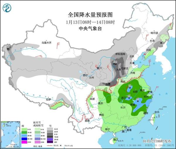 1月12日08時(shí)至13日08時(shí),新疆南疆盆地西部、甘肅西部、青海西部、內(nèi)蒙古大部、黑龍江西北部和東部、吉林和遼寧東部、華北北部等地部分地區(qū)有小到中雪或雨夾雪,其中,新疆南疆盆地和南疆西部山區(qū)等地部分地區(qū)有大到暴雪(10~16毫米)。東北地區(qū)西部、華北中南部、黃淮、江淮、江漢大部、西南地區(qū)東北部、江南、華南大部、臺(tái)灣島大部等地部分地區(qū)有小到中雨,其中,安徽南部、江西北部和南部、浙江北部、廣西東部、廣東西北部等地部分地區(qū)有大雨(25~45毫米)。新疆東部和南疆盆地、甘肅河西、內(nèi)蒙古中東部、吉林西部等地部分地區(qū)有4~6級(jí)風(fēng),其中,新疆山口地區(qū)風(fēng)力可達(dá)9~11級(jí)及以上。新疆東部和南部、青海西北部、甘肅西部和東部、內(nèi)蒙古西部、寧夏、陜西北部等地部分地區(qū)有揚(yáng)沙或浮塵,局地有沙塵暴(見圖3)。