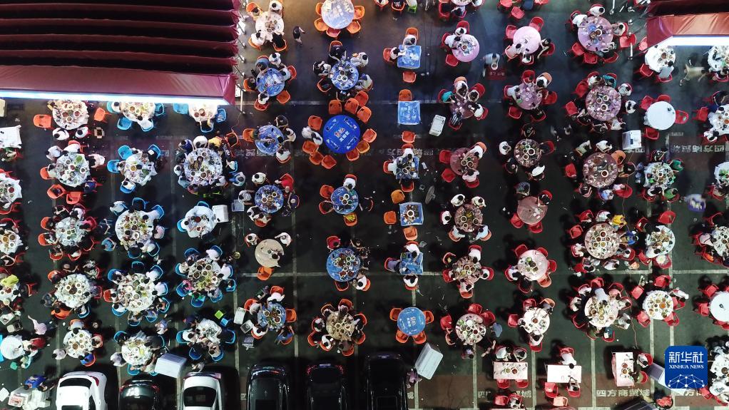 游客在湖南長沙四方坪夜市就餐(2022年7月29日攝,無人機(jī)照片)。新華社記者 陳振海 攝