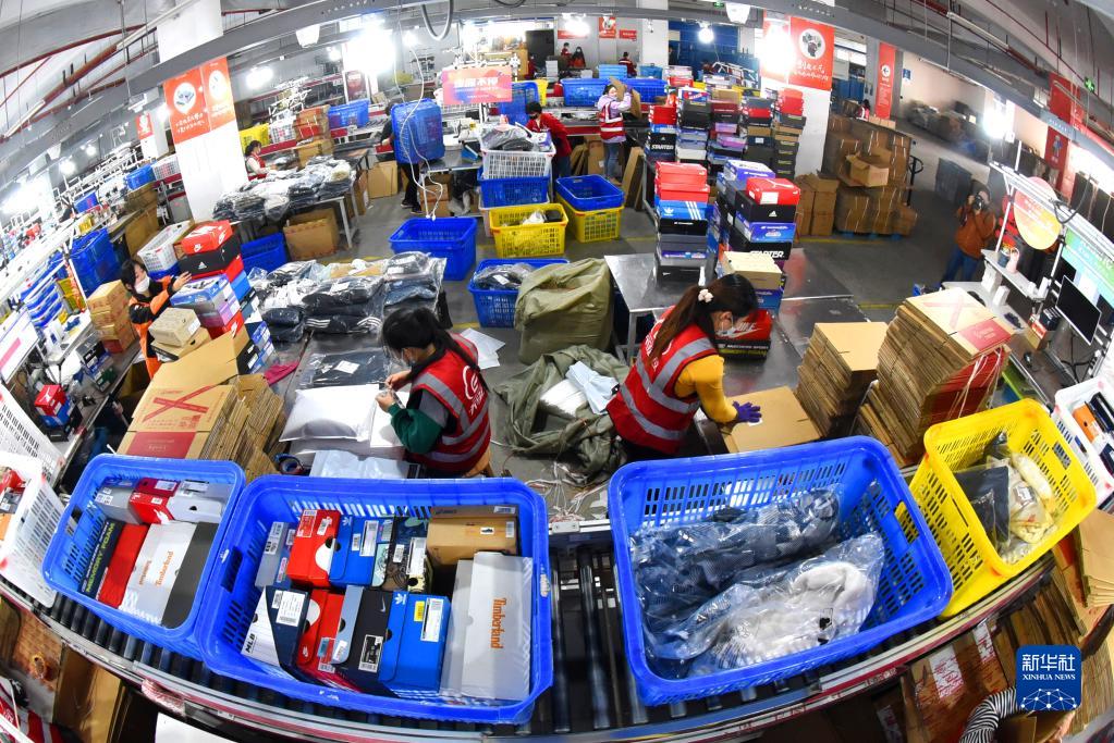工人在江蘇省連云港市海州區(qū)天馬電商產(chǎn)業(yè)園按照訂單分揀貨品(2022年11月11日攝)。新華社發(fā)(耿玉和 攝)