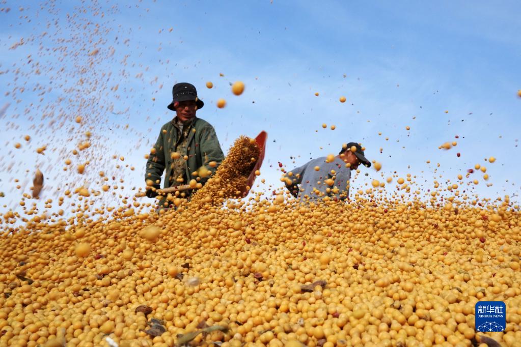 在北大荒農(nóng)墾集團(tuán)有限公司北安分公司趙光農(nóng)場有限公司,工作人員在一處曬場的大豆堆上忙碌(2022年10月20日攝)。新華社記者 王建威 攝
