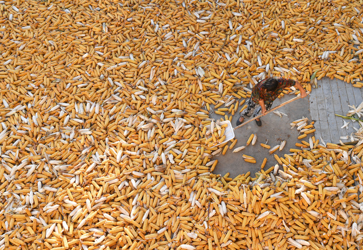 2022年9月17日,河南省尉氏縣張市鎮(zhèn)沈家村村民將收獲的玉米攤開。新華社記者李嘉南 攝