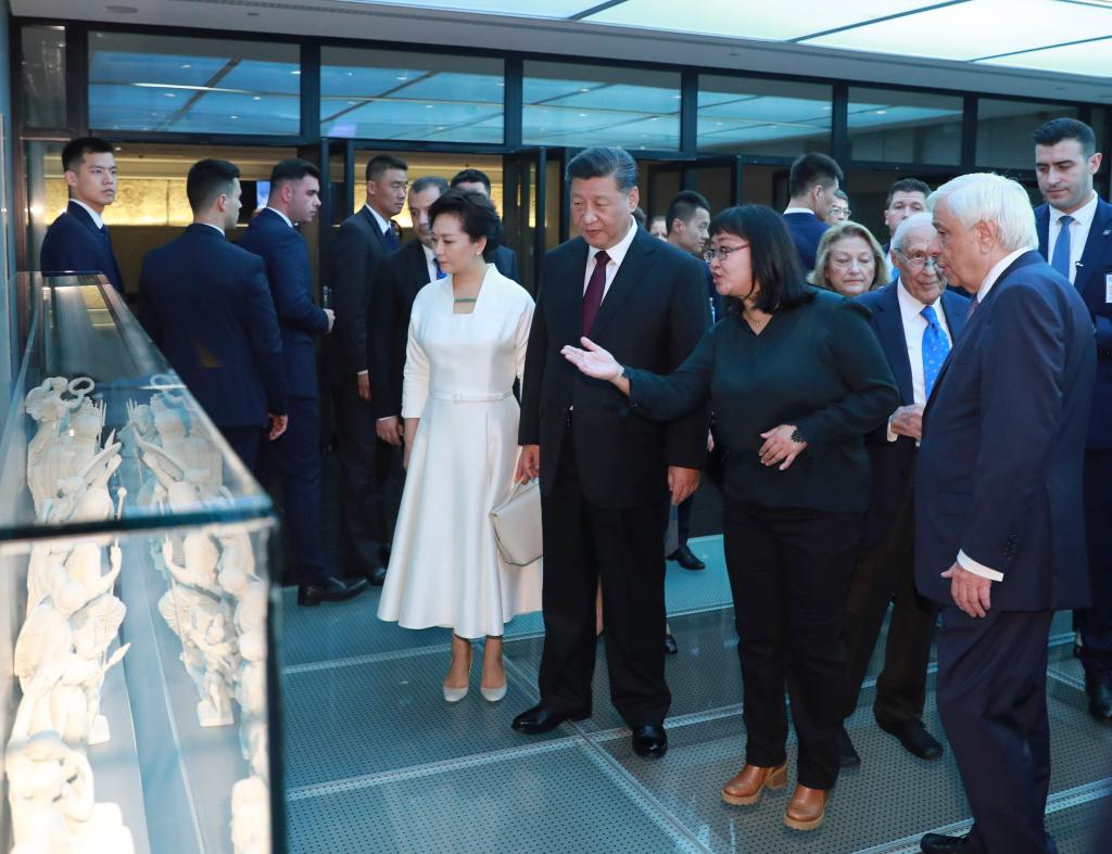 2019年11月12日,國家主席習(xí)近平和夫人彭麗媛在時任希臘總統(tǒng)帕夫洛普洛斯夫婦陪同下,參觀雅典衛(wèi)城博物館。