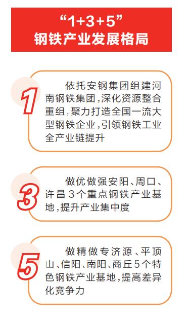 在產(chǎn)業(yè)布局上,打造“1+3+5”鋼鐵產(chǎn)業(yè)發(fā)展格局?!?”即依托安鋼集團組建河南鋼鐵集團,深化資源整合重組,聚力打造全國一流大型鋼鐵企業(yè),引領(lǐng)鋼鐵工業(yè)全產(chǎn)業(yè)鏈提升?!?”即做優(yōu)做強安陽、周口、許昌3個重點鋼鐵產(chǎn)業(yè)基地,提升產(chǎn)業(yè)集中度?!?”即做精做專濟源、平頂山、信陽、南陽、商丘5個特色鋼鐵產(chǎn)業(yè)基地,提高差異化競爭力。