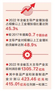 報告中的一系列數(shù)據(jù)顯示,2022年全省主導產(chǎn)業(yè)增加值占規(guī)模以上工業(yè)增加值比重達到45.3%,較2017年提高0.7個百分點,主導產(chǎn)業(yè)對規(guī)模以上工業(yè)增長的貢獻率達到48.9%。同時主導產(chǎn)業(yè)發(fā)展的質(zhì)效優(yōu)勢日益突出,如2022年全省五大主導產(chǎn)業(yè)實現(xiàn)利潤總額1305.72億元,其中食品產(chǎn)業(yè)和裝備制造產(chǎn)業(yè)分別以423.46億元和415.01億元位列第一和第二。
