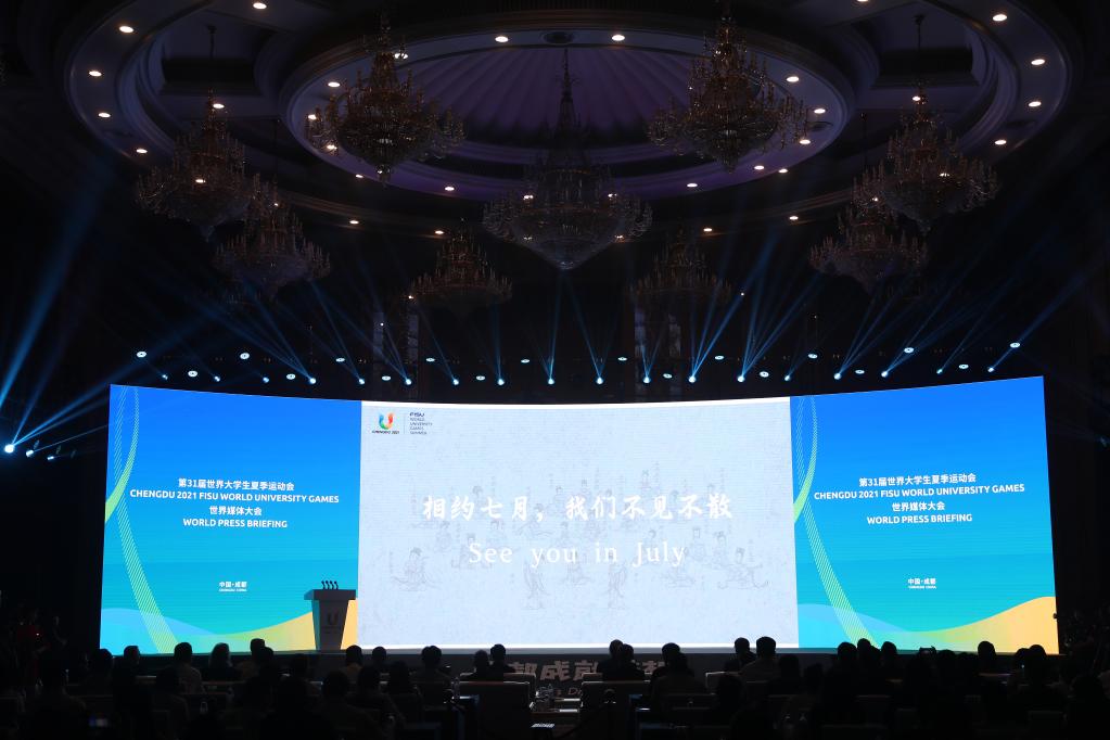 5月15日,第31屆世界大學(xué)生夏季運(yùn)動(dòng)會(huì)世界媒體大會(huì)在成都舉行。成都大運(yùn)會(huì)執(zhí)委會(huì)向全球媒體介紹了賽事籌辦進(jìn)展以及媒體運(yùn)行工作的相關(guān)信息。新華社記者 賈浩成 攝