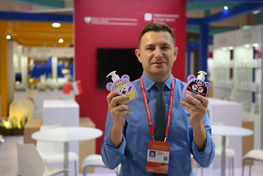 在第三屆中國—中東歐國家博覽會暨國際消費(fèi)品博覽會中東歐展館,企業(yè)代表展示來自波蘭的日用消費(fèi)品(5月16日攝)。新華社記者 黃宗治 攝