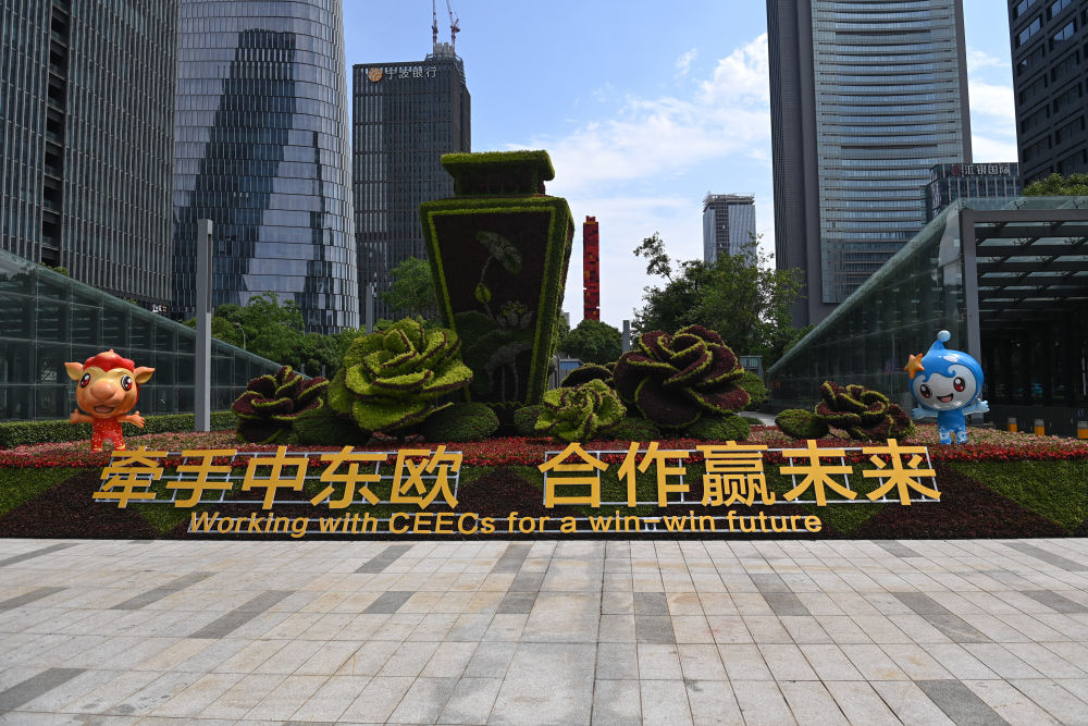 在寧波國際會展中心附近拍攝的第三屆中國—中東歐國家博覽會暨國際消費(fèi)品博覽會綠化景觀造型(5月16日攝)。新華社記者 黃宗治 攝