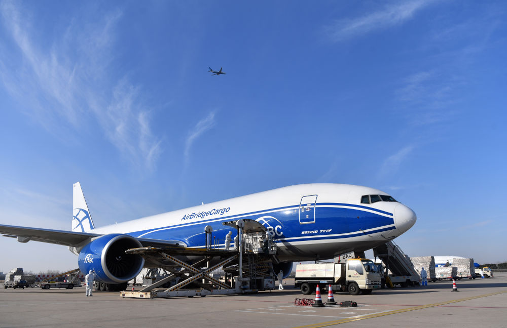 鄭州新鄭國際機場工作人員在為一架俄羅斯空橋貨運航空公司貨機裝貨(2021年12月30日)。新華社記者李嘉南 攝