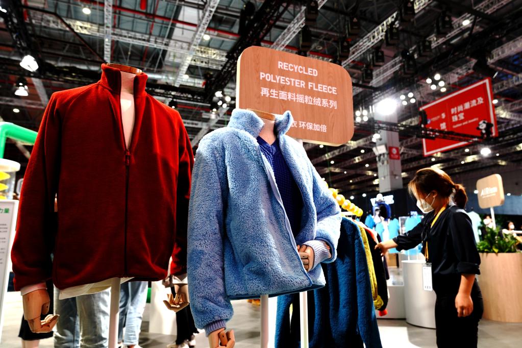 優(yōu)衣庫(kù)參展人員在第五屆進(jìn)博會(huì)上介紹參展的環(huán)保服裝,該服裝面料采用源自回收塑料瓶的再生聚酯纖維。新華社記者張建松 攝