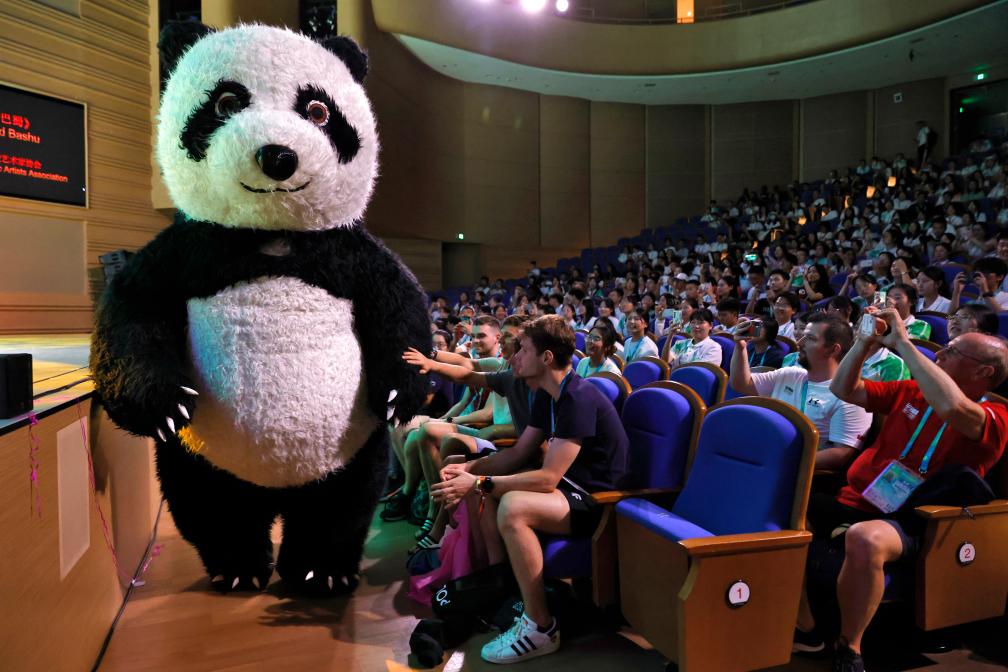 8月2日,一名演員裝扮成大熊貓?jiān)谘莩鲩g隙與觀眾互動。當(dāng)日,“奇幻之夜”雜技魔術(shù)晚會在成都大運(yùn)村藝術(shù)中心大劇場舉行。本場活動是在大運(yùn)村舉辦的“Be Together”主題系列晚會之一。新華社記者沈伯韓攝