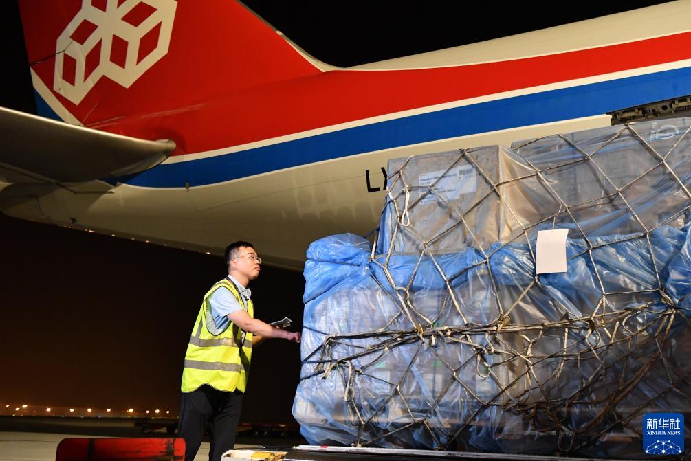 8月1日,工作人員在中國鄭州新鄭國際機場為一架盧森堡貨航貨機裝貨。新華社記者 李嘉南 攝