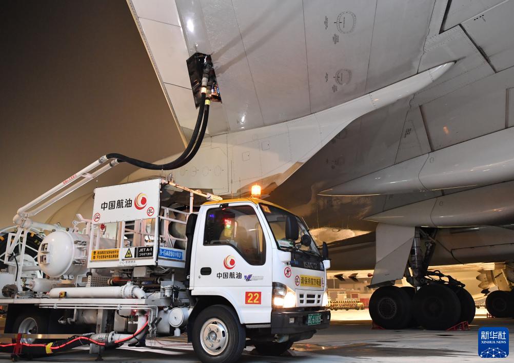 8月1日,在中國鄭州新鄭國際機場,中國航油華南藍天河南分公司的工作人員為一架盧森堡貨航貨機加油。新華社記者 李嘉南 攝