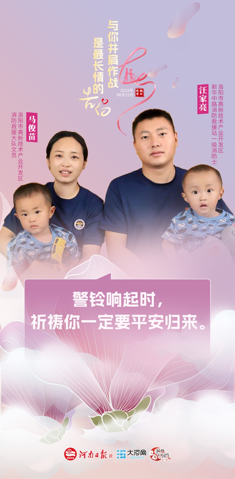 提起汪家亮夫妻,很多人都會羨慕他們擁有一個幸福美滿的家庭。從事消防事業(yè)已有16年個年頭的汪家亮,曾榮獲優(yōu)秀士兵一次,嘉獎三次,2022年還因工作表現(xiàn)突出榮立三等功一次。妻子馬俊苗現(xiàn)任洛陽高新技術產(chǎn)業(yè)開發(fā)區(qū)消防救援大隊文員。